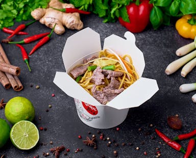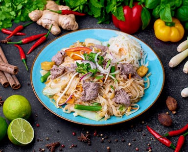 udziec wołowy smażony w woku z cebulą, czosnkiem, trawą cytrynową i sambalem, dodatkowo z warzywami: marchew, cebula, brokuł, papryka, cukinia, fasolka