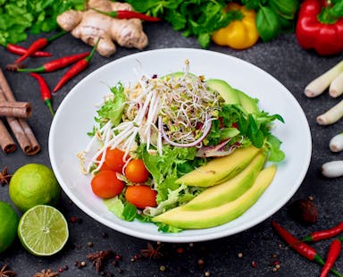 krewetki grillowane na woku, cykoria sałatowa, roszponka, radicchio, pomidor cherry, mango, papryka, kiełki