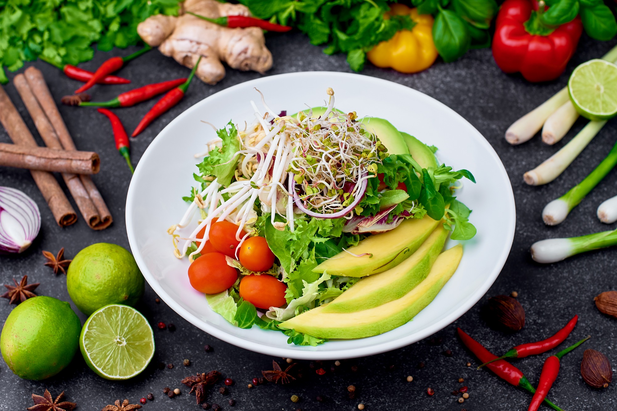 krewetki grillowane na woku, cykoria sałatowa, roszponka, radicchio, pomidor cherry, mango, papryka, kiełki
