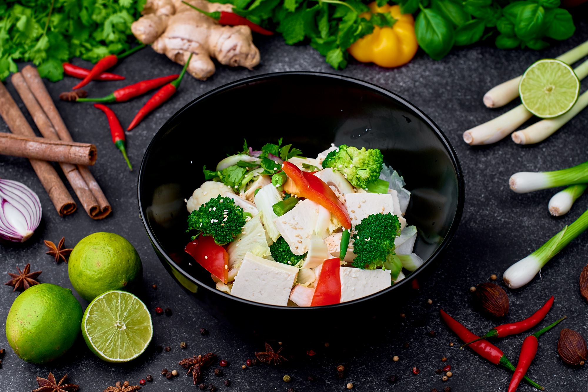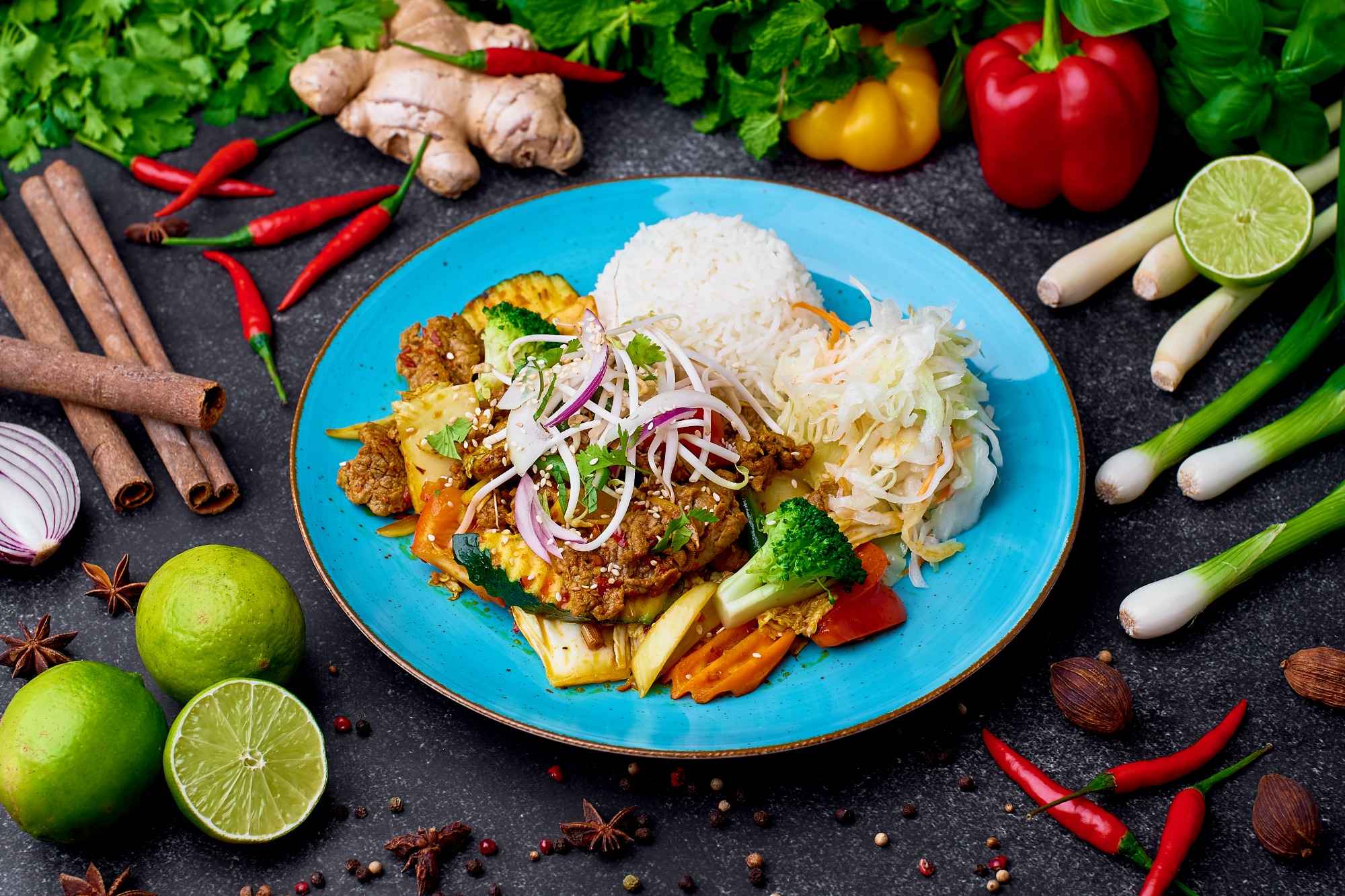udziec wołowy smażony w woku z cebulą, czosnkiem, trawą cytrynową i sambalem, dodatkowo z warzywami: marchew, cebula, brokuł, papryka, cukinia, fasolka